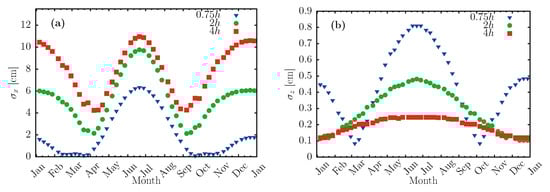 In the following graphs, to present results for a whole year, we calculate the daily standard deviation, which characterizes the spread of all mini-heliostats’ impact points. These are represented as and , for the x and z directions, respectively. Figure 6 shows the behavior of the daily standard deviations throughout the year, for array H4 located at 0.75h, 2h, and 4h. An increase in the standard deviation with distance occurs on the x axis (Figure 6a), while the opposite happens (Figure 6b) along z axis.