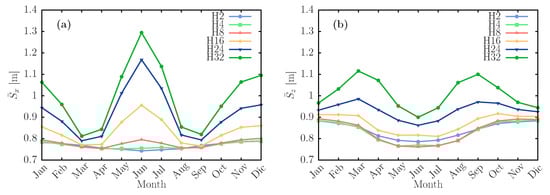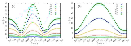 Daily standard deviations of facet impact points for the heliostat arrays H2, H4, H8, H16, H24, and H32 throughout the year, along the x (a) and z (b) axes. The arrays are located at (70 m).