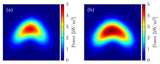 Figure 9 shows the radiative flux distribution for H32, for 21 June, which is the case with the highest radiative flux dispersion. The peak flux at 6:30 h is 2.978 kW/m, which increases to 5.242 kW/m at 9:30 h and remains unchanged until solar noon. This spread of the concentrated solar flux in June limits the concentration, compared to other months, i.e., 21 January, where a more compact distribution is obtained at solar noon, with a peak flux of 9.609 kW/m (similar in shape to Figure 8a, but not shown here for reasons of space).