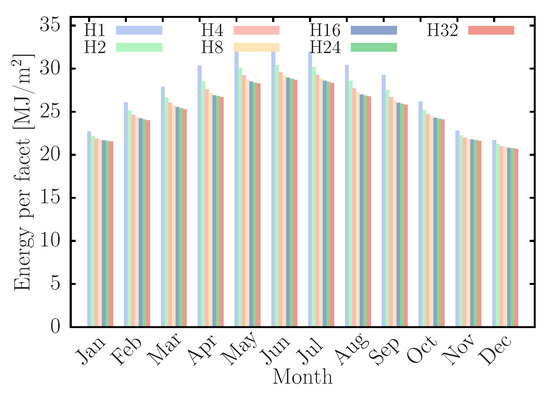 Based on the radiative flux distributions obtained, the daily energy incident on the receiver was calculated for the 21st of each month, for arrays placed at 0.75h. The results are shown in Figure 12, where an H1 array, energetically equivalent to a single heliostat with a zenith-azimuth tracking, is also presented for reference. The graph shows the contribution of daily energy per mini-heliostat, i.e., the total energy supplied, divided by the number N of mini-heliostats of the array. As expected, due to the imperfect tracking, the energy per mirror decreases with N. However, the graph shows that the maximum decay is always between H1 and H2, and becomes less significant as the array size increases. The annual average reduction between the H1 and H2 arrays is 4.4%, between H2 and H4 is 2.3%, between H4 and H8 is 1.21%, between H8 and H16 is 0.72%, between H16 and H24 is 0.39%, and between H24 and H32 is 0.38%. The trend is that the energy per facet for arrays larger than H32 will have little variation, although the shape of the concentrated solar flux distribution becomes irregular, as seen in Figure 9.