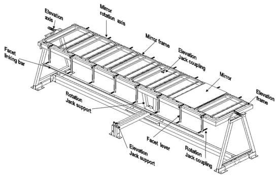Recently, a collaboration between IER-UNAM (UNAM’s Institute of Renewable Energies) and the private company Gadgets & Design S.A. de C.V., Mexico City, Mexico, started. We were awarded a one-year grant in the framework of PRODETES international award Mexico (Sustainable energy technology development project, by its Spanish acronym; funded by the Global Environmental Facility GEF of the World Bank). The aim of the project is to carry out the development of solar tower technology for high temperature industrial heat. This document describes the development of a linked array of mini-heliostats within this project. These heliostats move together in an elevation–Fresnel configuration as illustrated in Figure 1. The configuration consists of an array of mirrors that rotate around linked parallel axes, like a linear Fresnel reflector [17], but with an added elevation mechanism that inclines all those axes simultaneously in the North–South–Zenith plane. Thus, the arrangement of N facets is equivalent to N linked mini-heliostats moved by only two drives instead of . In particular, an eight-facet unit was built and tested with satisfactory results. Optical tests were carried out, where the radiative flux distribution, peak and average concentration ratios produced by the heliostat were evaluated and compared with ray tracing analysis. Additionally, this document examines the elevation–Fresnel tracking in detail and discusses the associated accuracy loss and its causes.