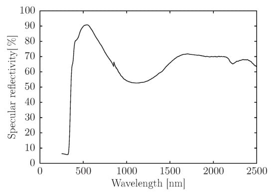 As shown in Table 1, back silvered glass mirrors with 6 mm thickness were used in the array. The spectral specular reflectivity of this mirror of Vitro brand is shown in Figure 14. The reflectivity deteriorates significantly in the infrared region (above 720 nm). It is not clear if the cause of this behavior is absorption by the glass or low reflectivity of the silver film, but this is low even compared to 6 mm mirrors from other brands. A value of was obtained for the broadband solar reflectance , by using Equation (14). A photograph of the prototype is shown in Figure 15.