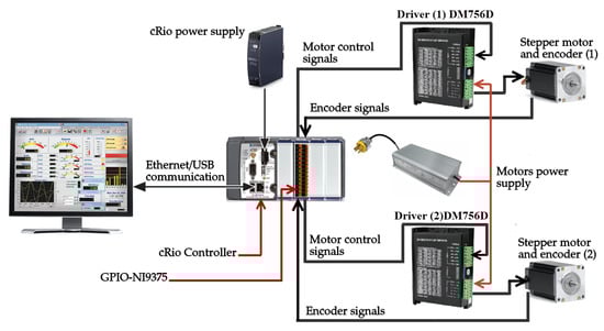 The instantaneous movement of the heliostat mirrors is determined by the tilt of the elevation frame and the facet angles. These angles correspond to two degrees of freedom: elevation and Fresnel rotation axes. Those rotations were automated by using two linear actuators from Venture, model MA-874418353-50M with stepper motors. The correct displacement of the linear actuators is controlled with an algorithm programmed in LabView, which was implemented on a model 9053 compact Rio (cRio) controller and a model NI9375 general purpose digital input/output module, both from National Instruments. The control system sends the electrical control signals (enable/disable, direction, and speed of rotation) to DM756D drivers in charge of providing the necessary electrical power for the actuators. Each stepper motor has an encoder, whose electrical signal is received by the NI9375 and processed by the CRIO to obtain the linear displacements of the actuators, which in turn are transformed to rotation angles around both axes of the array. Figure 16 shows a general diagram of the components of the heliostat’s electrical power and control system, as well as the flow of electrical signals.