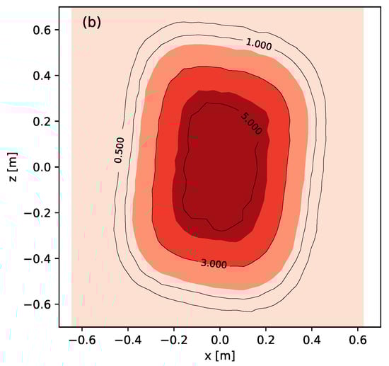 From both radiative flux distributions comparison, it is clear that their sizes are similar, although it is also clear that there are some features of the experimental results that are not captured by the simulation. The mean absolute deviations between theoretical and experimental values of the distributions are 0.6288 and , on the x and z directions, respectively. Nevertheless, as a rough measure of the similar size of both distributions, we find that 73.1% of the power falls within circles 0.91 and 0.90 m diameter, for the experimental and simulated distributions, respectively. For 80% of the power, these figures increase to 0.98 and 0.94 m.