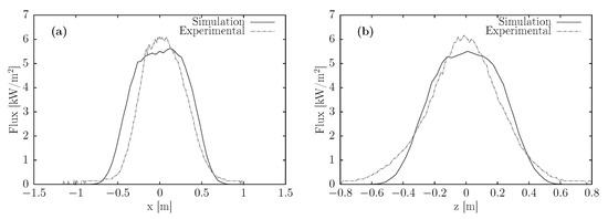 The experimental and simulated radiative flux distributions were compared in more detail by obtaining radiative flux distribution profiles on the x and z axes, as shown in Figure 18. These distributions were obtained along two axes passing through the power centroids of each of the distributions. The following expression gives the coordinates of these centroids