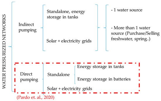 We present the cases found according to how we injected water into the system (Figure 1). Two options appeared: direct pumping (without head tanks) and indirect water supply (throughout the head tanks). We considered the first in [71], and we analyzed the second cases (indirect supply with head tanks as a guarantee for emergencies) found according to the municipality water precedence.