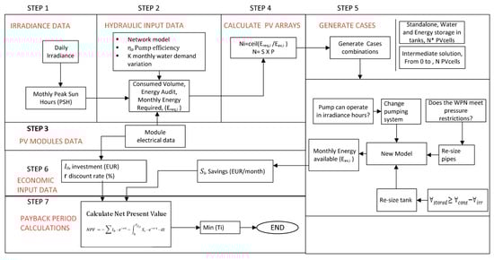 Figure 2 reflects the computation process described by seven steps. First, we can retrieve the irradiance inputs (Step 1). With the daily solar period data from Step 1 and the network model (pumps, pipes, etc.), we can calculate the energy consumption and volume required (Step 2). We can obtain the PV modules data (Step 3) and with the results gathered in Step 2, we can calculate the number of PV panels, N (S modules in series and P modules in parallel). The new cases are described in (Step 5), considering potential requirements (new diameters for pipelines, new pumps, increase volume of the head tank, etc.) and can also determine the energy savings (Step 5) for each probable situation (standalone SPWS or hybrid system). The latest situation (the WPN operates by taking power from the electricity grids) incorporates many potential schemes, each of them with the installation of several PV modules. Likewise, in Step 5, we can assess the purchases for the cases mentioned before, and determine the net present value for every scheme in Step 6.