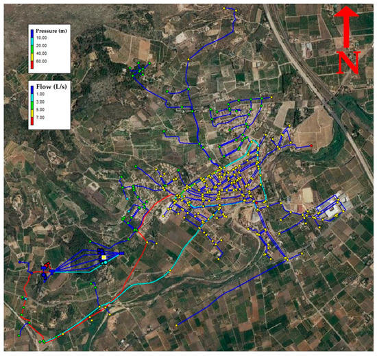 Figure 3. Town water pressurized network. - Pump ATURIAXRN6B (eight impellers). The curves of the pumps that show the head and pump efficiency variation with flow rates are depicted in Equations (3) and (4):