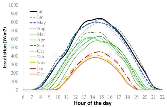 Solar radiation: The average radiation (W/m2) for each hour of the day, for each month of the year. This is essential to design the area of the solar park and to calculate the hours that the pump will work (and the frequency at which the inverter will work), depending on the month. We measured the irradiation data at the Sagra Station, which is located close to the WPN. The irradiation sensor was an SKU: 6450, and we integrated it into the Davis Pro 2 weather station. This station has been running since 7 November 2018, and we recovered data every 30 min (Figure 4). High irradiance months (July, June, May and August) can be seen in dark colors; the intermediate months (in green); and the low irradiance months (November, December and January) in warm colors. The peak sun hours (PSH) can be calculated from the irradiance data. The PSH ranges between 3.96 and 6.48 h in December and in July, respectively.