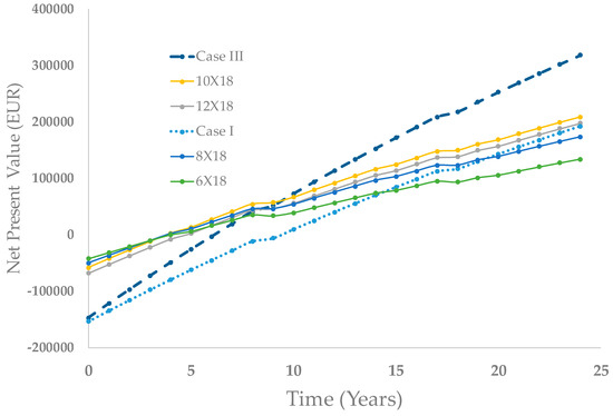 We have shown that the payback period is not a good indicator in this case (with high variability in savings). The lowest payback period (Case II 18 × 8 modules) resulted in the second-worst combination for the life cycle cost analysis.