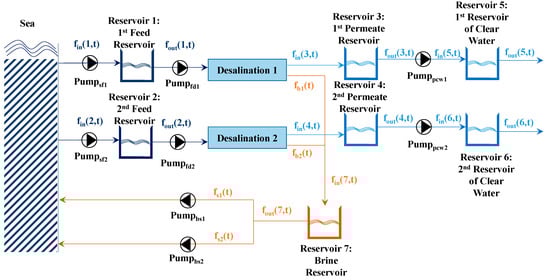 Concerning the operation of the desalination units, according to Equation (30) the produced clear water at each timeslot t will be equal to the sea water provided to the desalination unit multiplied by the Recovery Ratio R, as indicated in Equations (44) and (45). The water flowing out of the desalination units, and in Figure 1, is also limited by the Recovery Ratio as indicated in (36). Moreover, it is evident in Figure 1 that both desalination systems share a common reservoir for the brine produced from each one of them ( and ), thus constraints (46)–(48) shall be taken into account. The maximum flow rate of brine towards the Brine Reservoir (Reservoir No. 7 in Figure 1) is defined according to the Recovery Ratio of the desalination units as expressed in (49) and (50):