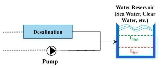 Moreover, none of the aforementioned studies, [2,3,4,5,6,7,8,9,10,11,12,13,14,15], or similar studies concerning simple unit commitment problems [16], take into account a detailed overview of the desalination system. In particular, all the water storage reservoirs that a desalination system comprises, alongside all the pumps filling or emptying those reservoirs, shall be taken into account when considering modifications in the desalination system’s demand. Unlike [2,3,4,5,6,7,8,9,10,11,12,13,14,15,16], this paper proposes a detailed representation of the desalination system, taking into account all the relevant constraints for the system’s operation. The mathematical representation of the aforementioned operation is incorporated in the day-ahead scheduling for the case of Greek NII systems in order to define the optimal management of the examined desalination system.