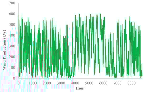 A wind generator of a nominal power equal to 600 kW is considered to be installed in Kythnos, with the production (Pmax,t in (27)) as depicted in Figure 4. The limit Rl for the RES injected power in (28) is considered equal to 30%.