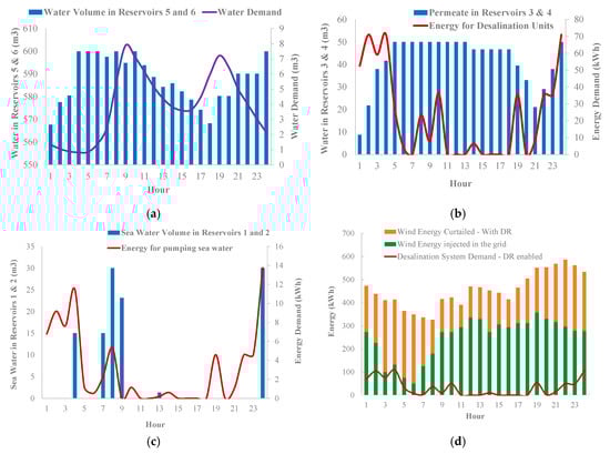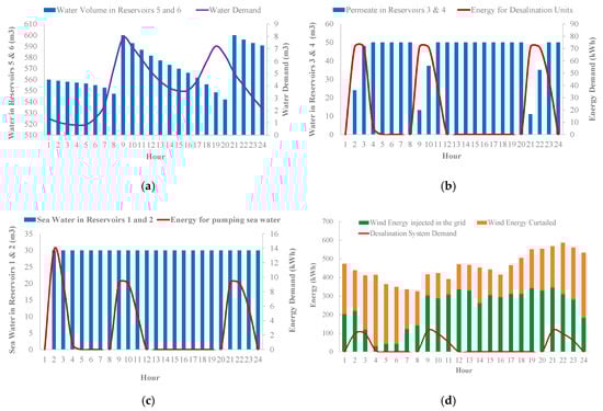 Figure 6c depicts the volume of the sea water in reservoirs 1 and 2 in Figure 1. It is noted that a steady water volume among two consecutive hours does not necessarily mean that there is no water flowing in or out of the relevant reservoirs. For instance, for the 23rd hour of the examined day, reservoirs 1 and 2 are filled up until the maximum level. The system requires at this particular hour 38 m3 of sea water to flow out of these reservoirs, in order to be provided to the desalination units, reducing the relevant volume of sea water lower than the required low-limit. Thus, sea water is pumped towards reservoirs 1 and 2, as it can be observed in Figure 6c. The operational power of the relevant pumps is enough to fill the reservoirs up until the High-level within the examined hour.
