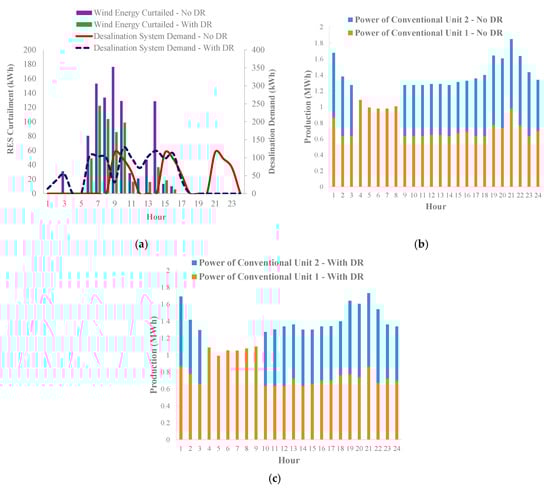 Operation of the desalination system with and without the relevant DR capabilities in 29/08/2019: (a) Comparison of the RES curtailment and the desalination system demand, (b) operation of the conventional generators without the DR capabilities of the desalination system enabled, and (c) operation of the conventional generators when the desalinations system offers demand response services.