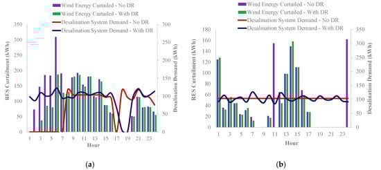 Comparison of the RES curtailment and the desalination system demand, when the desalination system satisfies the water requirements of the whole island of Kythnos. Operation with & without the relevant DR capabilities for (a) 06/01/2019 and (b) 13/07/2019.