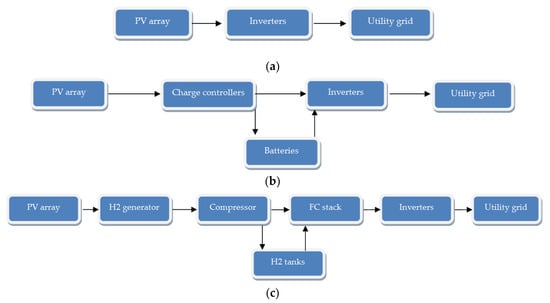 Figure 1. Block schemes of three investment scenarios: (a) without electricity storage, (b) with energy storage in batteries, (c) with energy storage in hydrogen. - Scenario 2. Energy from the PV system is stored with batteries and sold at the price of the afternoon peak (Figure 1b);