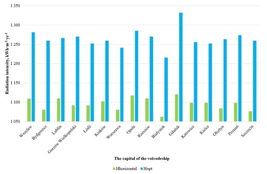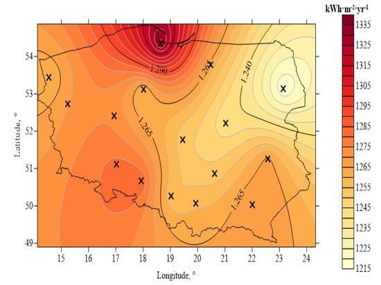 The average value of the radiation intensity for Poland is 1265 kWh·m−2·yr−1, which is remarkably similar to the values found in other European countries, such as: Germany, Czech Republic [].