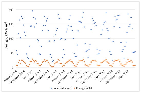 The main disadvantage of the PV panel is the aging process. It relates to a decrease in efficiency. In Figure 5 solar radiation and PV system energy yield is shown. The monthly average solar radiation and energy yield measurements are represented by dots. For comparison of the results the solar radiation, and the energy yield are expressed in kWh·m−2. There is a visible trend in the amount of electricity produced depending on the season of the year. Statistical analysis of the presented data provided an information about average decrease in energy production, which was further used in, economic analysis.