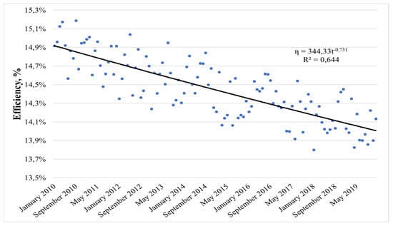 The efficiency of the PV system, which includes both inverter and PV panels, depends on many variables. However, the PV panels are mostly sensitive to the operating temperature. The efficiency of the energy production decrease with the increase of the temperature. The recommended production conditions are high solar radiation (above 800 W·m−2) and low temperature (>10 °C). Based on these measurements, the average annual decrease in electricity yield ΔE = 0.60%·yr−1 was determined.