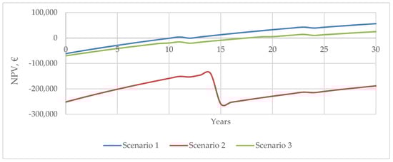 Figure 7 shows the actual discounted and accumulated cash flows, whose intersection with the horizontal axis allows to determine the actual payback period. The scenario without energy storage (Scenario 1) achieves a positive economic effect, approximately within 10 years. Significantly longer takes the reaching of a positive investment effect for the Scenario 1with the storage of electricity in hydrogen (about 18 years). Unfortunately, the variant with lithium-ion batteries (Scenario 2) will not pay off in the investigated period. The significant drop of the NPV value for Scenario 2 around year 15 for “Batteries (Figure 7.) is caused by the need to replace the batteries set which is associated with very high investment costs. The detailed results of the analysis are presented in Table 8.