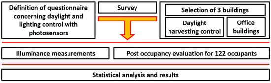 This research is based on the occupants’ preferences together with lighting measurements. A questionnaire was designed that can demonstrate user preferences regarding daylight integration and lighting control. Three buildings were selected (A, B and C), each one with different control algorithm (closed loop, open loop and integral-reset control algorithm) in their daylight harvesting control system, in order to investigate their performance. The selection of these buildings was based on two factors: the suitability of the building (i.e., installed lighting control systems) and the availability of users to participate in a survey. The latter is a major problem since by publishing any energy-related results, the value of the buildings might be affected. Thus, there is a reluctance from building owners to participate in surveys or measurement campaigns. A total of 122 people were involved in the questionnaire and an equal number of task areas were measured. Figure 1 shows the methodology used. Lighting measurements combined with the occupants’ preferences were statistically analyzed. Presented in the following paragraphs are the examined buildings, the definition of the questionnaire, the lighting measurement and the statistical analysis procedures.
