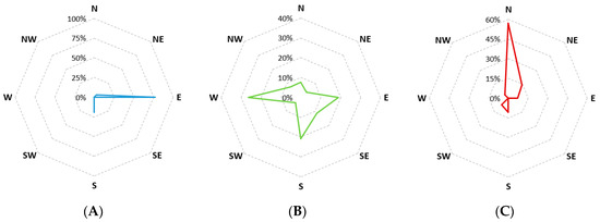 Position of the occupants’ working planes concerning the orientation of the building façade where the office spaces were located for each examined building (Building A: left, Building B: middle, Building C: right).