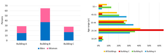 The sample of the occupants that were selected, were between 20–60 years old. (Figure 6, right). The questionnaire was completed by a total number of 122 occupants (53 women, 69 men, Figure 6, left). The questions are presented in Table 2. The format of the questionnaire was based mainly on rating scales. Rating scales are used so as to model the respondents’ feedback in a comparative form and are applied in various types of surveys where respondents are expected to assess or classify attributes, such as performance, efficiency, etc. The rating scales are suitable for field research due to their reliability and efficiency for subsequent statistical analysis. Based on the answers, researchers were able to associate a qualitative measure with a certain attribute or feature. The answers were on an ordinal 5-point scale from ‘too much’ to ‘very poor’ and a 3- or 4-point scale, while some questions used a tick box (Table 2). The occupants were not trained or informed before filling the questionnaire, in which simple questions were used. This was a prerequisite for the current research. We believe that any training to the occupants prior the questionnaire could affect their responses, especially their awareness to the lighting controls systems, a crucial factor for their successful implementation in to the buildings.