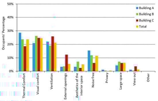 In the first question (Table 2), the occupants ranked the three parameters that are most important for them in making an office environment a pleasant one. In this question, the users indicated what they want mostly and not necessarily what they experience in their office. Visual comfort, thermal comfort and ventilation are ranked as the most desired features with average with average occupants’ preferences 24.6%, 23.8% and 21.3%, correspondingly (Figure 8). On the other hand, in the second question, the occupants voted for what they experience in their offices. These comparable values for the individual examined buildings are shown in Figure 9. The results of occupants’ satisfaction for Buildings B and C related to the most parameters came out very well. Only visual comfort came out well for Building A, because of the lighting control system with photosensors and occupancy sensors.