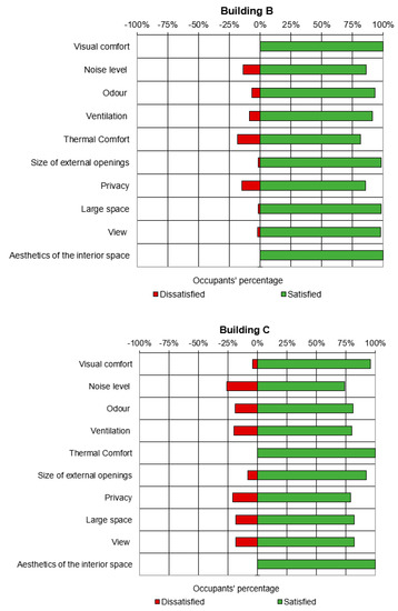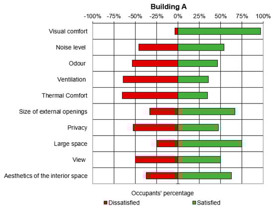 Satisfaction (green color) and dissatisfaction (red color) of different parameters (Visual comfort, Noise level, Odor, Ventilation, Thermal Comfort, Size of external openings, Privacy, Large space, View, Aesthetics of the interior space) for the examined buildings.
