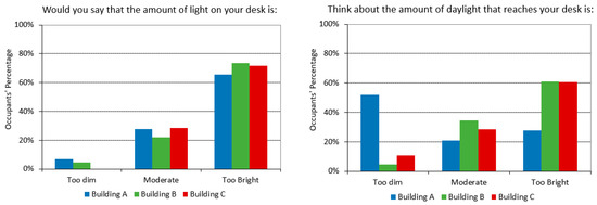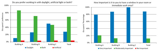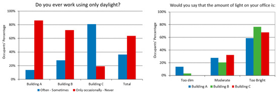 As most of the occupants want to work with both daylight and artificial lighting (Figure 10, left) a daylight-harvesting system is preferable than a simple on-off switch. Thus, every user selected that the existence of an external opening is very or moderately important (Figure 10, right). However, only the users of Building C prefer their workplace to be illuminated solely by daylight, while the majority of the employees of Building A oppose it (Figure 11, left). Most of the occupants reported that there is too much light, not only into the entire area of their offices but also in their working planes. Their answers were almost the same either for their space or desk (Figure 11, right, and Figure 12, left). This is due to the overall and general lighting design using a typical grid. None of the buildings had placement of the luminaires according to the task areas. The occupants of Building A, while reporting high illuminance values for both daylight and artificial lighting (Figure 12, left), they also reported low amounts of daylight reaching their working space (Figure 12, right). This means that in many working positions in Building A, the luminaires above them were emitting their maximum light flux. In this building, the control of solar gains is realized by both external and internal shading systems (Figure 2, middle) which are adversely affecting daylight levels. In open-plan spaces, their use can result in gloomy conditions and hence low daylighting levels. A façade renovation can definitely improve the aforementioned conditions [10,11,12,13,14].
