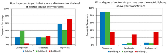 Results of how important is from the occupants to control the level of artificial lighting over their working plane (left) and in what degree (right).