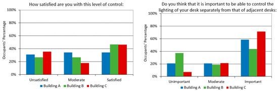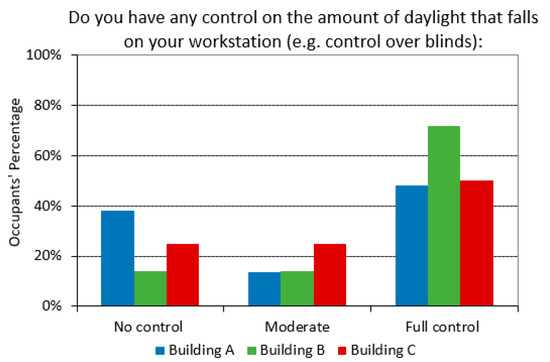 From the total number of the users, 21% of them were not aware of the existence of a daylight harvesting control. The less awareness was recorded in Building C, where 43% of the occupants in that building did not know about the installed photosensors. The users’ responses show different reactions for the occupants of the buildings concerning light controls (Figure 13, Figure 14 and Figure 15). The users of buildings A and B had similar responses concerning the degree of control that the users have over the artificial lighting above their working plane (Figure 13, right). In general, the occupants stated that it is important to be able to control not only the artificial lighting above them (Figure 13, left) but also to control it separately from the advancement areas (Figure 14, right). However, they are highly or moderately satisfied with the degree of control of the lighting system that they have (Figure 14, left). It should be mentioned that daylight harvesting was in an automated mode in all examined buildings. Moreover, both buildings A and B do not offer their users the ability to override lighting controls or perform manual control (almost 90% of the users in buildings A and B; Figure 13, right). On the contrary, Building C offers that ability. For this reason, over 60% of all the users have expressed a strong desire to control the level of artificial lighting (Figure 13, left). Furthermore, while it could generally be expected that the degree for individual control would be high, the reality of control especially in areas with shared control groups, strengthens these convictions (Figure 14, right). Most of the users, over 50% for all the case studies, have the ability to control the amount of daylight that impinges on their working plane (Figure 15) by using the internal blinds (Figure 2 and Figure 4, left) to prevent direct solar radiation.