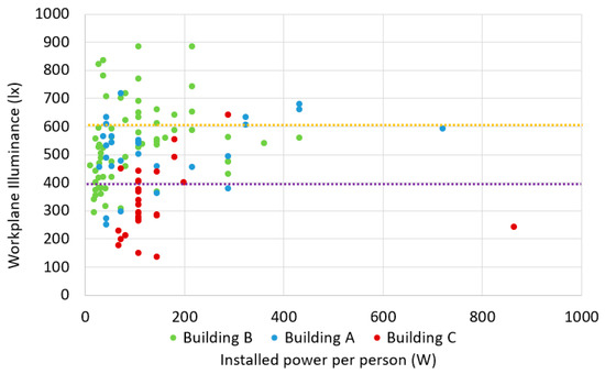 According to EN 12464-1 [81], the target illuminance in an office space is 500lx. Figure 16, Figure 17 and Figure 18 present the lighting measurements concerning the installed power per person, glare, the total amount of light and daylight that experience in their space. With the help of an orange (upper limit) and a purple (lower limit) dashed line, a comfort zone of 500 ± 100lx was highlighted [86]. Most of the occupants (67%) are working in spaces with installed power up to 108W per person (Figure 16), emitting light that results from 150l to 883lx in illuminance values.