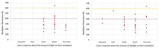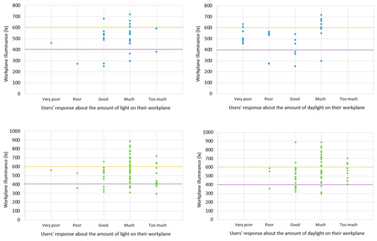 Occupants’ response for the amount of total lighting levels (left column) and the corresponding daylight on their working plane (right column) in relation to the measured illuminance (Building A: Upper part, Building B: Middle, Building C: Lower part).