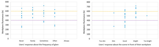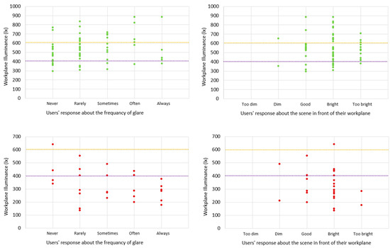 As glare can be affected by how bright a scene can be, the frequency of glare and the brightness of the external views were examined through the measured lighting levels (Figure 18). There is a debate regarding the selection of an upper illuminance limit above which daylight is not preferable due to glare. While most of the users experienced bright scenes, the frequency of glare was declared from “never” to “sometimes”. Even in Building B, where there are high illuminance values, the same users felt, correctly, that the bright environment as the illuminance values were up to 900lx. However, as noted above, while the glare is related with luminance (cd/m2) distribution rather than illuminance values (lx).