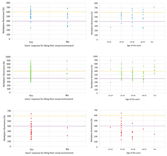 Illuminance measurements vs. the occupants’ response concerning liking their visual environment (left) and their age (right).