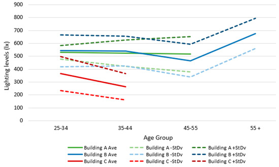 Returning to age, it seems that the young age of the Building C users (mainly 25–34) were not affected by the reduced lighting levels (Figure 20) as 93% of them like their visual environment even if it is dimmed below 400lx in most cases. In Building B, where their users of increased age work (+55, Figure 19), a preference for illuminance values between 559 and 794lx was recorded (Figure 20). Figure 20 shows the average measured illuminance values along with the standard deviation per group age in which the occupants’ response for liking their visual environment was positive. The measured values of negative responses were not taken into account. These results verify the newer edition of EN12464-1 [87], in which, using the scale of illuminance (from 500 to 750lx) the lighting designer can decide if the illuminance levels should be raised by at least one step when working conditions or age require it. However, a high percentage of older staff should be within the specific working area. This is due to the retinal illuminance that decreases as people getting older and can be attributed to the reduction of the pupil size and higher spectral absorption of the crystalline lens. Higher lighting levels are needed also for persons that underwent presbyopic corrections [88].