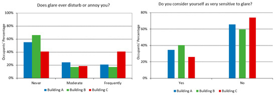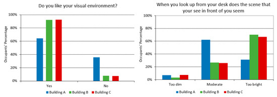 Most of the users are satisfied with their visual environment with the slight exception of the Building A (Figure 21, left). The use of the external blinds in Building A may dissatisfy some occupants because the deterioration of the view. More than 50% of the occupants consider themselves as insensitive to glare (Figure 22, right). The main sources of glare were the reflections on the monitors either by the artificial lighting systems or the daylight. The employees’ satisfaction of their visual environment was tested by taking into account (a) the abundance of light when they look in front of them (Questions 6 and 7, Table 2) and (b) the frequency of glare incidents (Questions 6 and 8). Variable from question 6 (Is your visual environment pleasing?) is a dummy variable and variables from question 7 (When you look up from your working plane does the scene that your see in front of you seem…) and question 8 (Does glare ever disturb or annoy you?) are of ordinal Likert scale, thus a direct correlation analysis is not feasible. Instead, a Mann–Whitney test is preferred. The Mann–Whitney test for questions 6 and 7 returned a z value of −3.176 which denotes statistical significance at the (<0.01) level. This result shows that when employees consider the light in their front view as adequate (inside the field of view of the human eye looking forward), they tend to show greater satisfaction for their visual environment (including their working surface). The relationship across the three buildings was tested and we acquired statistically significant result only for the Building B. In addition, the results of the test for questions 6 and 8 returned a z value of −0.345 with no statistical significance. Therefore, glare does not seem to affect the visual comfort satisfaction level of employees at the measured illuminance levels. To test for any differences across the buildings three tests were also conducted returning no significant results. Hence, the absence of any relationship between visual satisfaction and glare is confirmed for the whole sample. In addition, user sensitivity to glare was tested by estimating the number of glare incidents that encounter for all buildings (Questions 6 and 8). Since the variable of question 9 is a dummy one, the test will rely on the Mann–Whitney method. The tests performed over all the three buildings returned no statistically significant result. Thus, it is concluded that sensitivity to glare does not influence the judgement of employees regarding the frequency of glare incidents in their work.