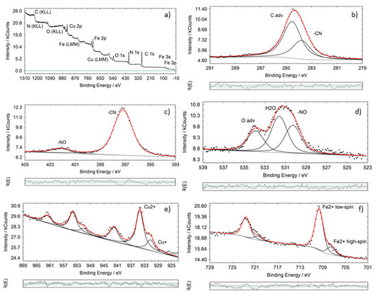 In Table 2, the quantification of the species is also reported for both samples. It can be observed that, in general, the main parts of the formula—e.g., NO, CN and the ratio between Cu and Fe, reflect the expectations. Nevertheless, deviations such as the apparently higher CN content in both samples or the higher metal content in sample II could be traced back to surface contaminations [38] or uncertainties in the analysis procedure. However, for such reasons, XPS is used here mainly for elucidating the chemical states (i.e., oxidation states or bond motifs) of the elements involved.