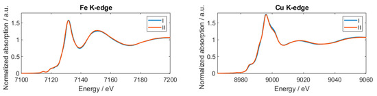 XANES traces at Fe and Cu K-edges for both samples I and II. Spectra were recorded on as-synthesized powders.