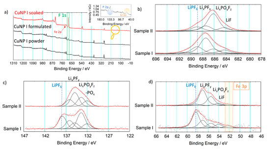 With the formulation of the electrodes, new XPS signals relevant to Teflon are expected to appear (in the F 1s spectrum). Moreover, by also adding the contribution of the electrolyte, the presence of Li 1s and P 2p in surveys can be detected. In Figure 3a, the comparison of survey spectra of sample I between powder, CuNP formulated and CuNP soaked is shown.