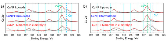 It is also worth mentioning that both samples related to CuNP 6 months in electrolyte show very small Cu signals: this can be evidenced through the signal to noise ratio. Of course, this is obvious considering that growing films of degradation products attenuate the photoelectron intensity of the buried formulated electrode.