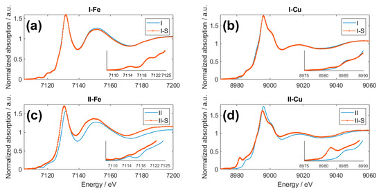 X-ray absorption spectroscopy spectra of samples I and II before and after contact with the electrolyte solution (S), taken at Fe and Cu K-edge after six months. (a) sample I at Fe K-edge (b) sample I at Cu K-edge (c) sample II at Fe K-edge (d) sample II at Cu K-edge.