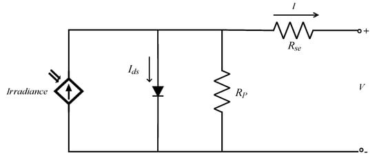 where, are the photon current, diode saturation current, diode ideality factor, series resistance and the parallel resistance, respectively. These five parameters must be estimated for the modeling of single-diode solar cells and modules, while represent the electron charge, Boltzmann constant, and temperature in Kelvin, respectively.