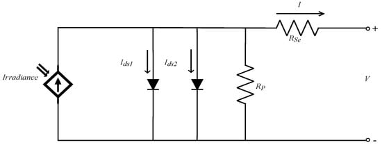 The second most utilized PV model is a double-diode model, presented in Figure 2. The I–V characteristics of the double-diode model are depicted in Equation (2) [14]: