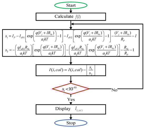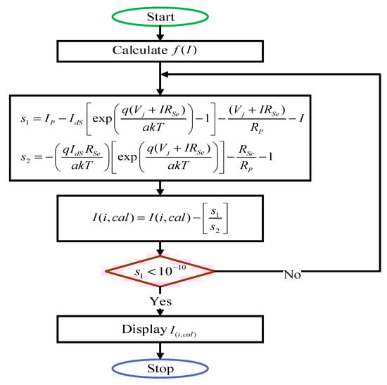 Equation (5) is then solved by the Newton–Raphson method (NRM), as represented in Figure 3, where, illustrate and its derivative, respectively, represents the calculated current obtained by solving Equation (5) for the I–V data. The difference between and is then obtained by considering RMSE as an objective function (OF):
