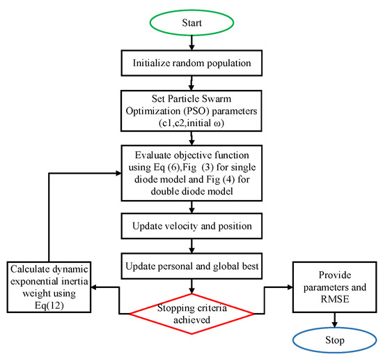 The comprehensive evaluation of literature depicts that a lot of work has been presented in [21,22,23,24] to cope with the premature convergence problem of conventional PSO. However, the studies [21,22,23] have not proven the strength of the proposed approaches on a real-time practical system, that undergoes variation in irradiance and temperature levels, hence increasing the computational burden. There is thus a need to present a dynamic strategy that can effectively deal with the issues of conventional PSO in real-time scenarios. This paper proposes a double exponential dynamic inertia weight PSO (DEDIWPSO) for the parameter estimation of single- and double-diode cells and modules. This inertia weight strategy was inspired by decreasing the rate of an exponential function. The fast growing nature of the exponential function improves the speed of convergence by maintaining a balance between the global and local search. The notable contributions of this paper are mentioned below: