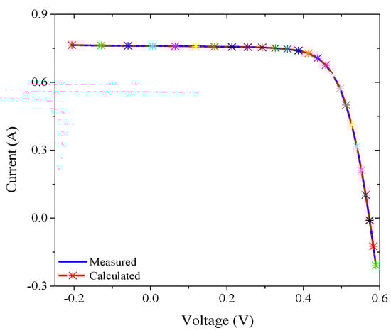 I–V curve of the measured and calculated currents for the single-diode cell.