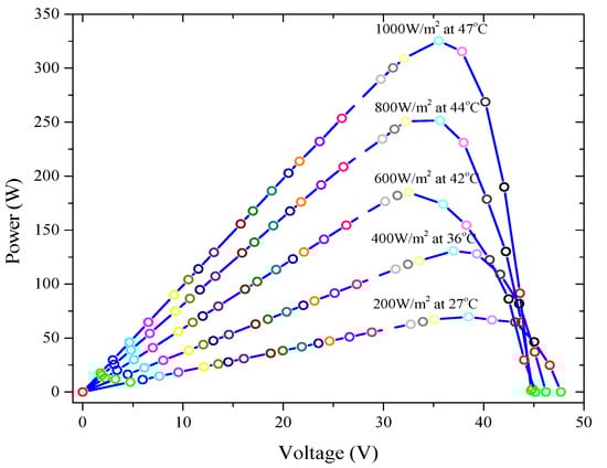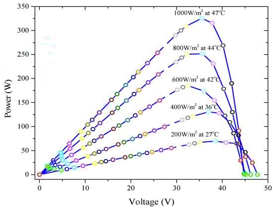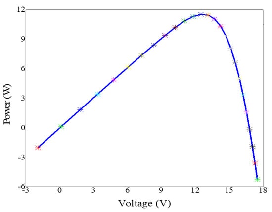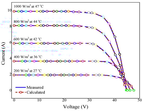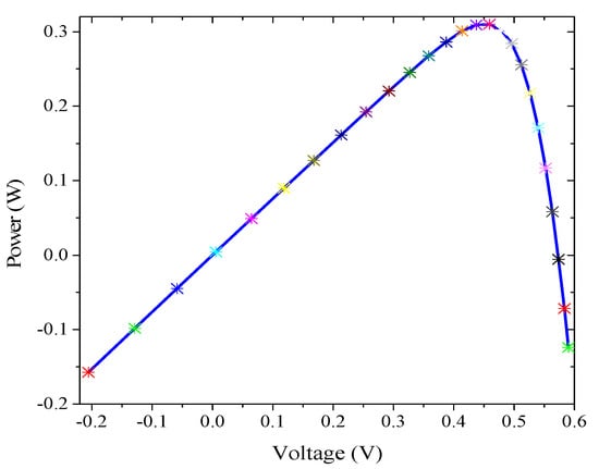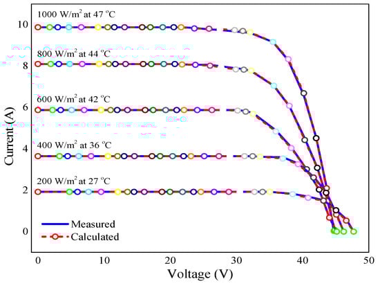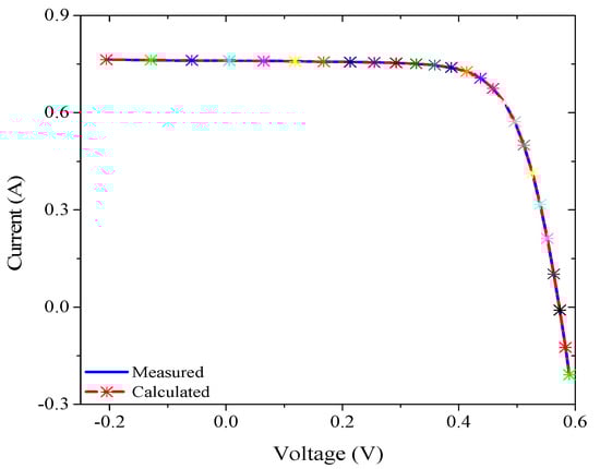 Figure 6 presents the I–V curve of the calculated and measured data, which shows that the calculated data closely follow the measured data. Moreover, the obtained parameters were utilized to compute the output power for each given data set and were plotted as P–V curve in Figure 7.